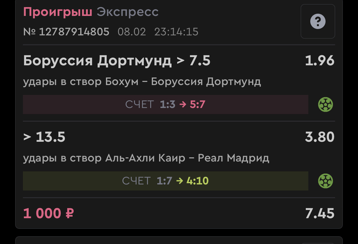 Спасибо, но они сказали в поддержке(через запрос), что они берут результат с официального источника(espn). В котором как раз таки 8 ударов) и это не минуты в исходах)) это результат матча!!! Это по их логике, мю в 99/00 не выиграл бы лч, потому как мю забили только только второй под занавес) да и они берут время на расчёт ставки после матча, а тут прям сразу рассчитали) я много лет ставлю, и такое вот, извините, НАЕБАЛОВО - впервые)