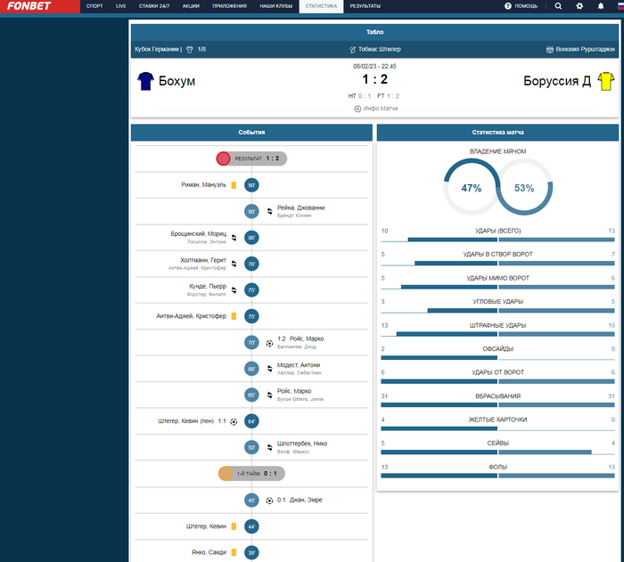 вообщем дело такое. Поставил пресс из 2-х ставок на удары в створ. а мне ставку не засчитали, а хотя на всех сайтах со статистикой, в том числе на сайте откуда Фонбет берет информацию, и с официального сайта кубка Германии по футбол, стата выигрышная) не знаю как быть, потому как служба поддержки бреет, мол мы правы)