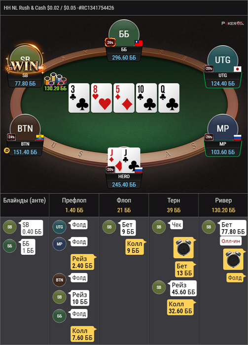Вообще да, 4бет префлоп здесь получше смотрится. Коллим только если у оппа 3бет в SB 5% и менее. Смысл в том, что если опп вколлит 4бет, то там уже не останется оверпар QQ+ (или останется лишь незначительная их часть) и такой спот будет гораздо проще сыграть с инициативой.
