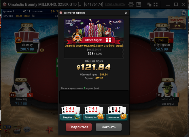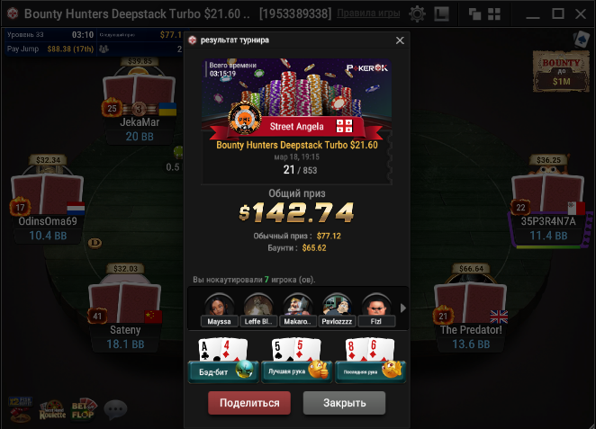 Хорошо отыграл воскресенье, просто супер, но Тильт жуткий чиповал 54 Main Event, не выбросил на репуш 33бб АКо в итоге поехали в монетку и след рукой АА и кулер, увы увы. И пересидел BabyShark19 с Nesher-boy в 126 баунти ... Всем хорошей недели и удачи за столоми