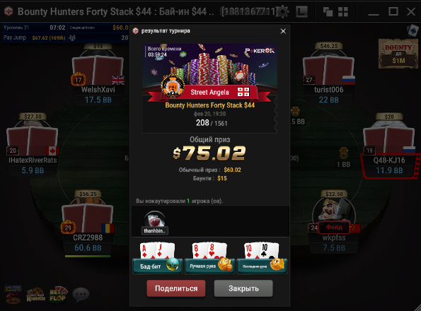Вышел на финалку по 11$ в топ-2 довёл любителя и он запихал 45 бб с 22 против моих КК и того топ-2, + - два дня в 0, всем хорошей катки и пару весёлых раздач вам в ленту 😜