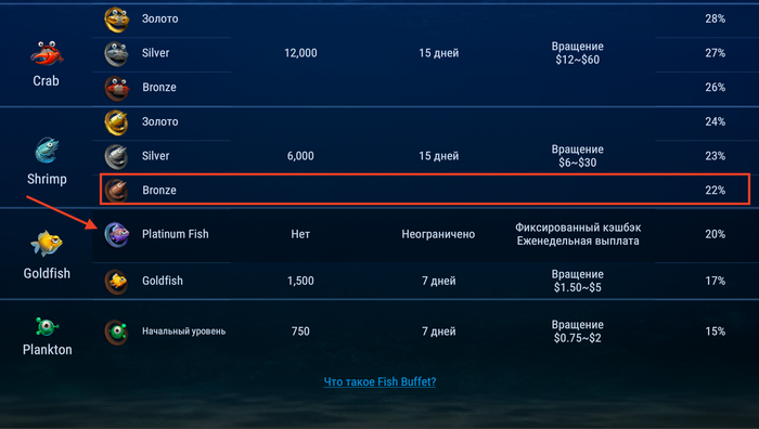 - Platinum Fish начнут с Bronze Shrimp. Platinum Octopus начнут с Bronze Whale.