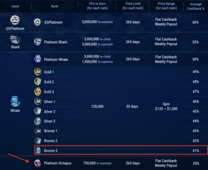 Тебе нужно заполнить Platinum Whale, чтобы стать Platinum Shark, а затем Platinum Shark, чтобы стать GGPlatinum.