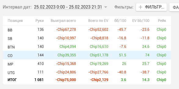 ⏺EV на PS: +6.4бб/100 на 22к рук.