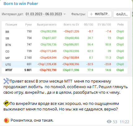 Дорогой дневник. Начало марта такое ужасное, как и сам февраль. Минус за минусом на каждой сессии. Нервы начинают по тиху сдавать, а скорость подгорания пукана с каждой сессией увеличивается. Я понимаю, что в МТТ главное дистанция и крепкий БР, но ментальная часть всё равно проседает.
