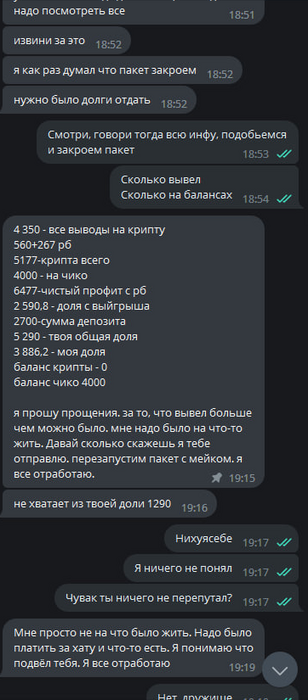 На момент когда я узнал, что игрок выводит деньги без моего ведома (было и раньше дважды, только суммы менее существенные) решил остановить сотрудничество, на тот момент моя доля равнялась 5290.8$, а на балансах было только 4000$. На запрос вернуть их получил ответ что их нет