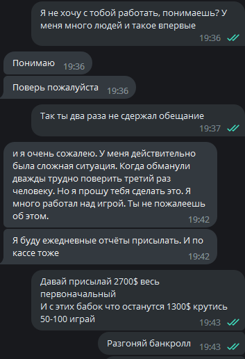 Умолял дать еще шанс. Ок. Вывел свои первоначальные вложенные 2700$ и он начал играть с 1300$, обещая отчеты и отыгрыш дистанции. Естественно отчеты игнорились, катка не каталась, бр опустился до 400$. На сегодня сумма претензии = 2590.8$
