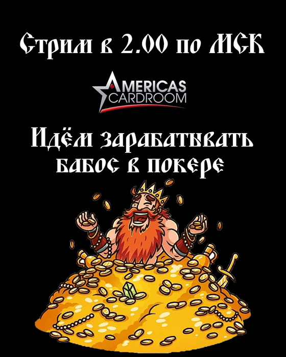 Отобрался во второй день в турнире за 2.5 бакса на АКР. В 2.00 по МСК запущу стрим. Второй день начинается сразу с призов. Стек 20 ББ. Попытаюсь раскрутиться и пройти по дальше в турике. https://www.twitch.tv/viking_alesha