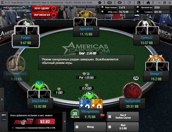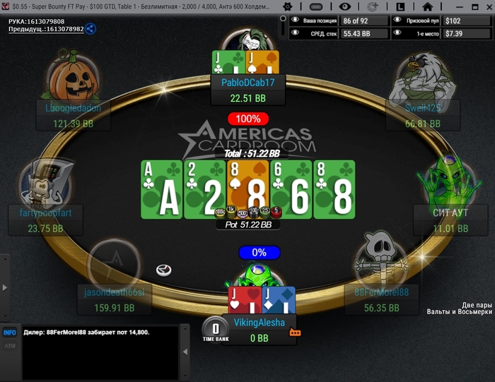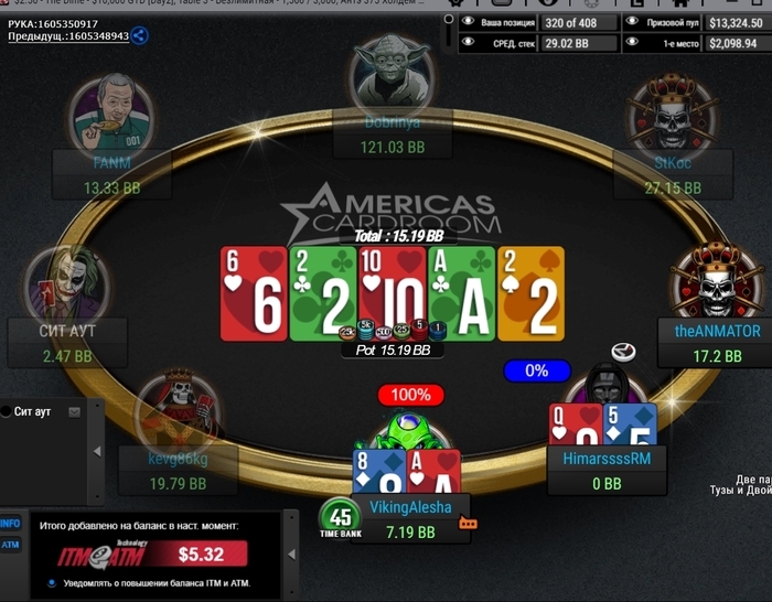 Просидел несколько кругов.карта вообще не заходила. Оставалось 5 ББ, я пушанул с А5 одномастные. Один игрок меня колл.Я удвоился.Потом снова карты не было. раздают АД в меня летит пуш,я колл. Как видно ниже аппонент выиграл.