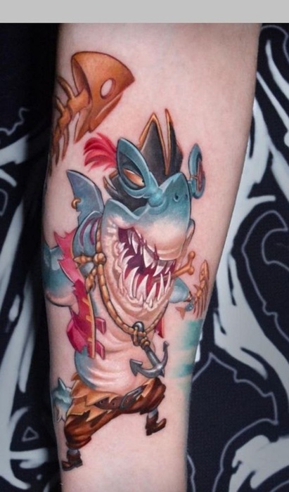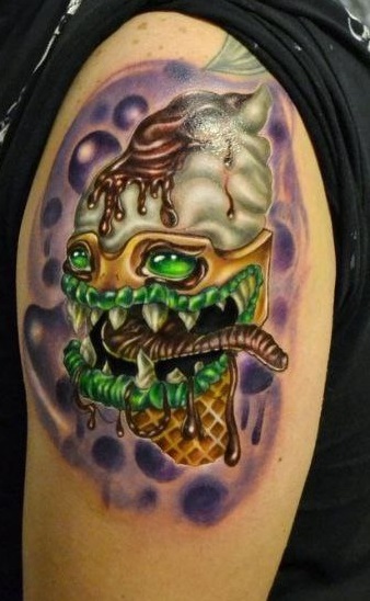 Я был в эйфории. Люблю всё красочное. И я тут же захотел себе ещё что-то набить. Так как идей было в голове куча, я и то хотел и то хотел. И придумал такую мульку. Если я где-то в ВК вижу интересную картинку,которая мне нравится. Я должен на следующий день ее набить. И тут началось. Бывало что я за неделю набивал 3 тату у разных мастеров. Благодаря этому познакомился с кучей мастеров в разных стилях. А потом я в ВК нахожу мастера,который придумывает тату в стиле который меня зацепил просто жуть. Стиль называется нео-классик наверное. Я вижу этот рожок-мороженное и в голове."Алёша!! Это нам надо" И так я знакомлюсь с мастером Денисом. ДАльше буду называть его по нику в инсте Денчик(мне так привычнее)