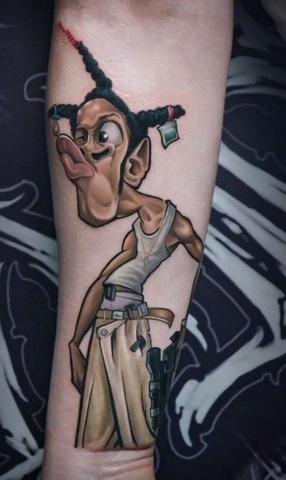 Проходит время. Денчик такой.Лёха.когда будем бить новые тату. А у меня был творческий кризис,я не знал что я хочу набить. Ничего не цепляло. И я говорю. Я не знаю,что хочу. Проходит пару дней. И Ден скидывает мне эту женщину. Я такой. Это просто бомбяо. Тут и моя фраза. и поговорка из жизни."Ты еще себе х..й на лбу набей." И мы ее делаем.
