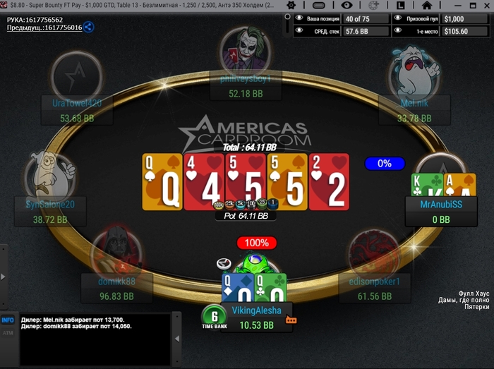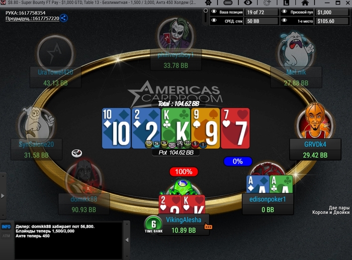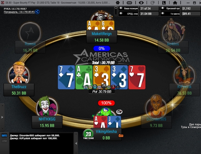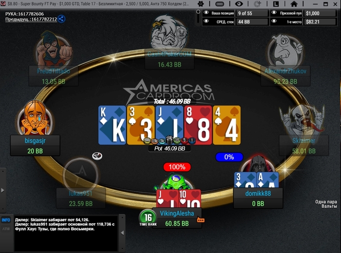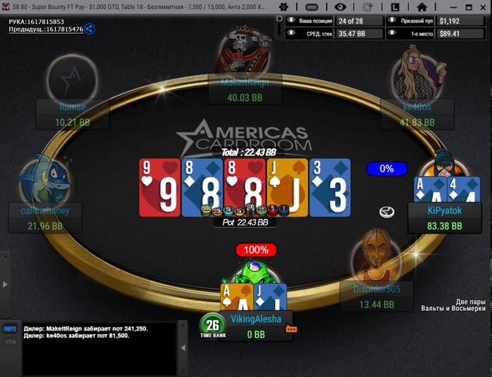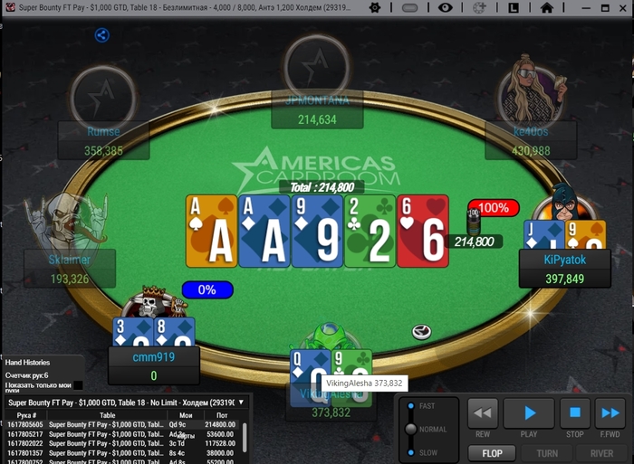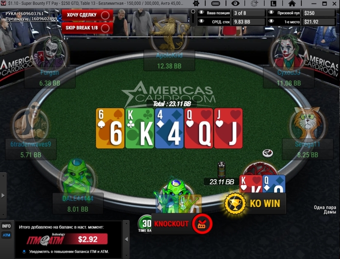 В колонках песня Руки Вверх. Чужие губы тебя ласкают,чужие губу шепчут тебе.... а это значит время рассказать,как идет моя карьера покериста.ну что сказать. Ж О П А )))) В туриках игра в последнее время не складывается. Баланс сильно просел. Последний турик немного подлечил. БР 100 Баксов ровно. Сел в дорогой турик(для меня дорогой)я де Лёха-фрирольщик. за 8.8 баксов. Где за нокаут дают 6 баксов. Ниже 4 нокаута,в которых я победил