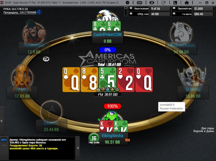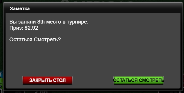 А затем проиграл два выставления .И оба раза карманным восьмеркам. В первой я ловлю пару старше,но на ривере закрывают флеш аппоненту. во второй раз мои А 10 просто проиграли 88. Занял 10 место. Обидно. Финалка 8 тел и призы только на финалке. ну ничего. когда нибудь будет первое место.