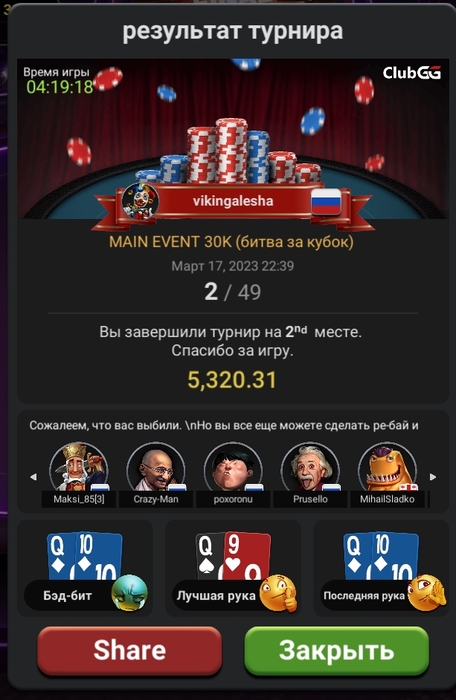 Попутно сел играть в турнир в одном из GG клубов. Вход стоил 600 руб в турнир. Я сделал 2 входа. Итог занял 2 место. 5320 руб упали на аккаунт. Хороший плюс. Хотелось конечно первое занять.Но боги рандома решили,что сегодня 2-е место моё.