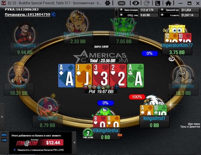За "Лёху Фриролл" слыхали? Сел покатать фриролл на АКР. Было почти 6000 чел.Мин приз был 3,43$ дотянул до 174 места, Итог +12,44$ чистыми.Оставалось 4 ББ,пришли девятки карманки было принято решение пушить, но сет не положили.БР на АКР теперь 62,57$