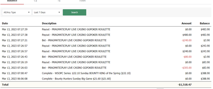 Ну просто если бы даже мошенник решил, что ему маловато и решил в рулеточки раскрутку устроить, ну ок, он увеличил до 600 баксов, удвоился фактически, но нет, он продолжил их лить. GGпокерок, я так понял вам плевать в целом на свою репутацию, вы начали зарабатывать любыми доступными способами? Саппорт молчит, всем плевать. И я уверен в том, что они сейчас напишут что не несут ответственности за доступ к аккаунту третьими лицами. Но в этом и разница между порядочными румами и GG, на ПС даже если бы кто то вошел с другого устройства я как минимум получил бы уведомление и скорее всего еще бы и аккаунт забанили и я бы потом его неделю восстанавливал через саппорт, но хотя бы средства на счету сохранились бы. А на GG даже этого сделать не могут. Из чего я снова делаю вывод, что единственным выгодополучателем в данной ситуации является сама платформа GGпокерок в казино которой осели мои деньги.