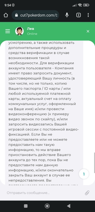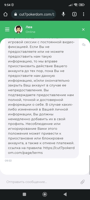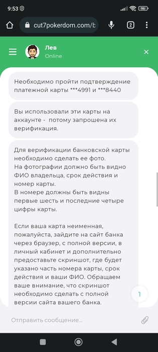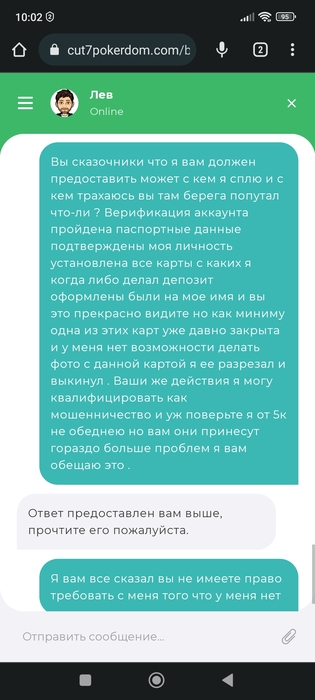 Racoon @ 15.03.23Добрый день форумчане. Не буду долго писать в кратце закинул очередной деп. На покердом сыграл турнир и поставил на вывод пришел отказ попросили предоставить фотографий кредитных карт с которых когда либо были сделаны депозиты на что я им ответил что одна из карт уже закрыта и карту я выкинул на что меня вежливо послали нахер . Не жду сочувствия просто оставлю это здесь может это кому то поможет из тех людей кто захочет связаться с этим гадюшником не тратьте свое время и не портить себе нервы обходите его стороной .