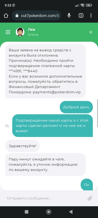 Добрый день форумчане. Не буду долго писать в кратце закинул очередной деп. На покердом сыграл турнир и поставил на вывод пришел отказ попросили предоставить фотографий кредитных карт с которых когда либо были сделаны депозиты на что я им ответил что одна из карт уже закрыта и карту я выкинул на что меня вежливо послали нахер . Не жду сочувствия просто оставлю это здесь может это кому то поможет из тех людей кто захочет связаться с этим гадюшником не тратьте свое время и не портить себе нервы обходите его стороной .