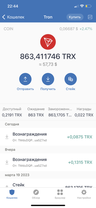В данном случае это TRX в кошельке Trust (покупала на бинансе). У этой крипты есть возможность получения ежедневного дохода