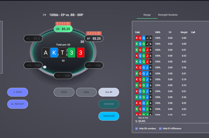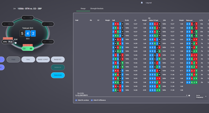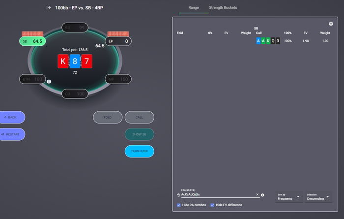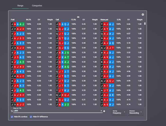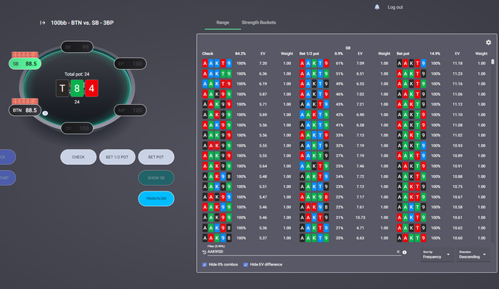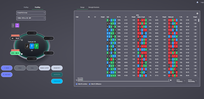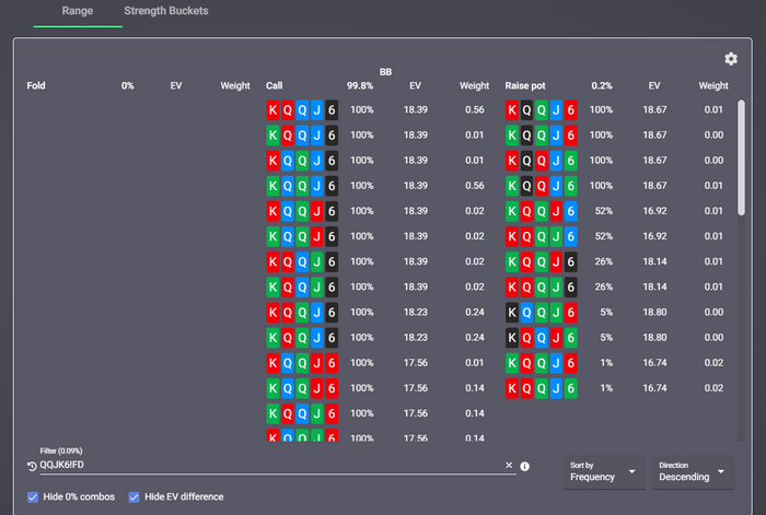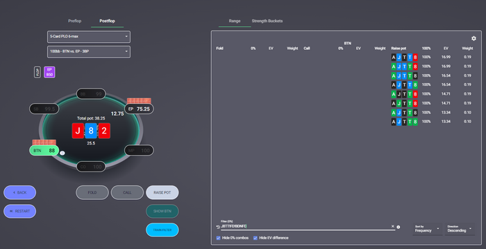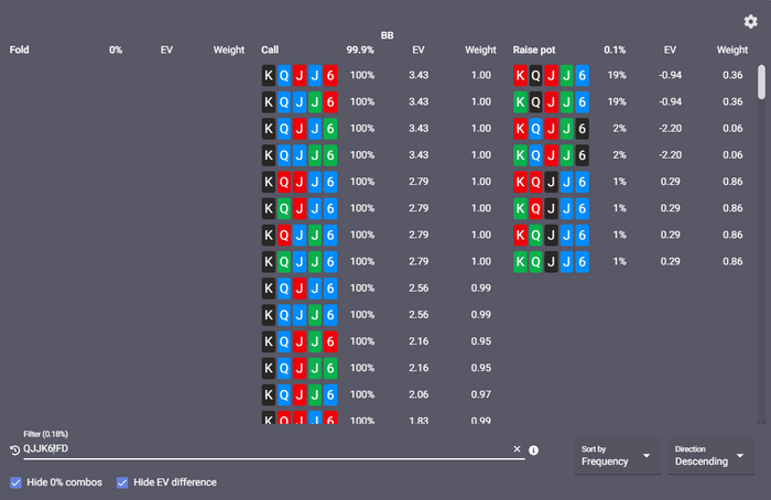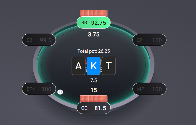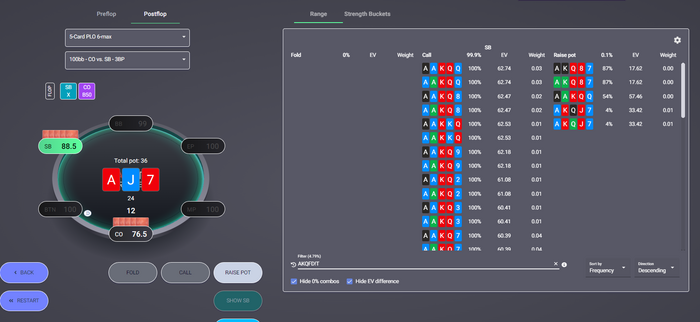 На флопе нашу руку солвер играет рейз 100%. Единственное замечание, руку с К, вместо А, он мне почему-то не показывает
