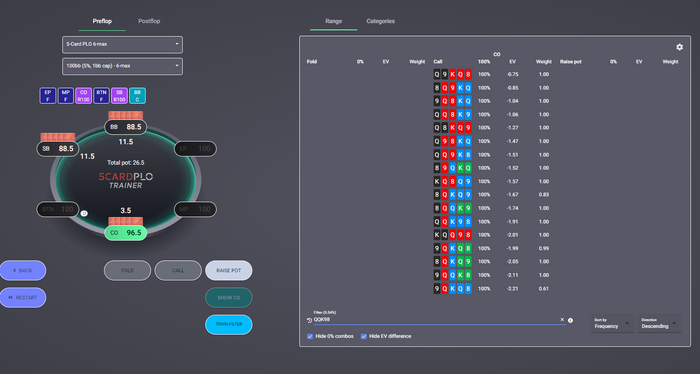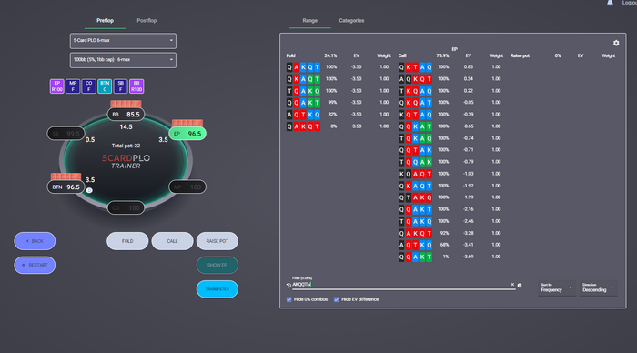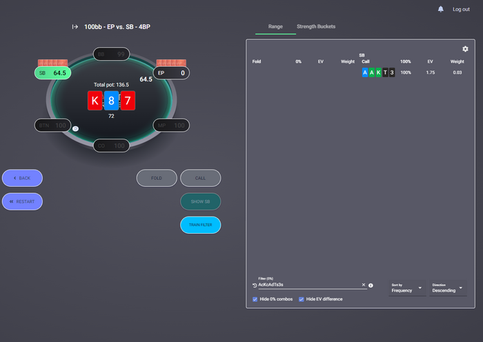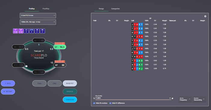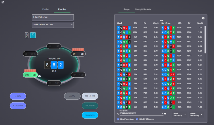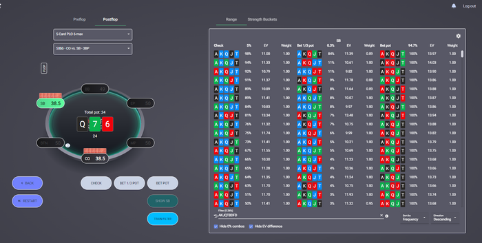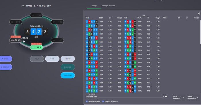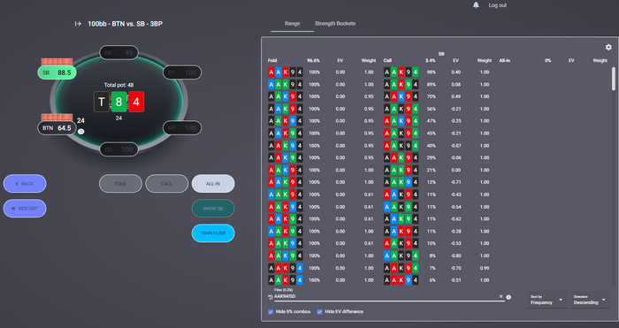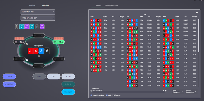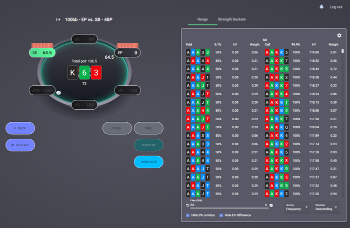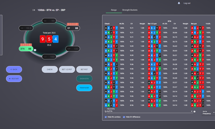 На флопе нашу руку солвер играет рейз 100%. Единственное замечание, руку с К, вместо А, он мне почему-то не показывает