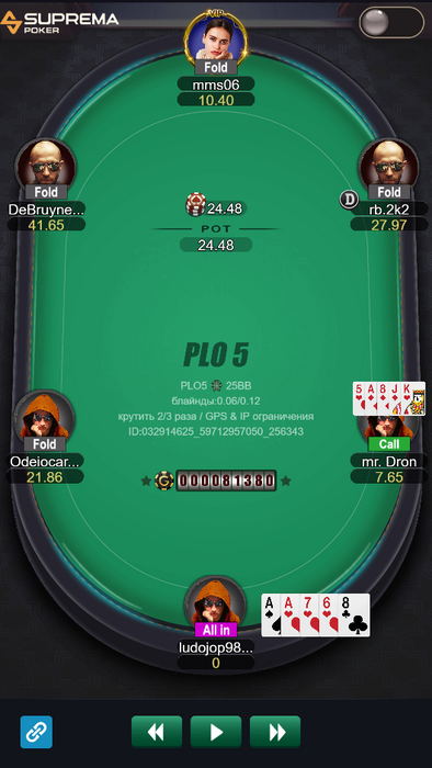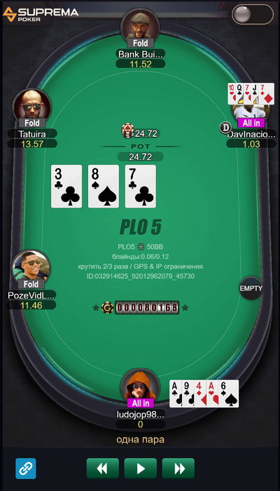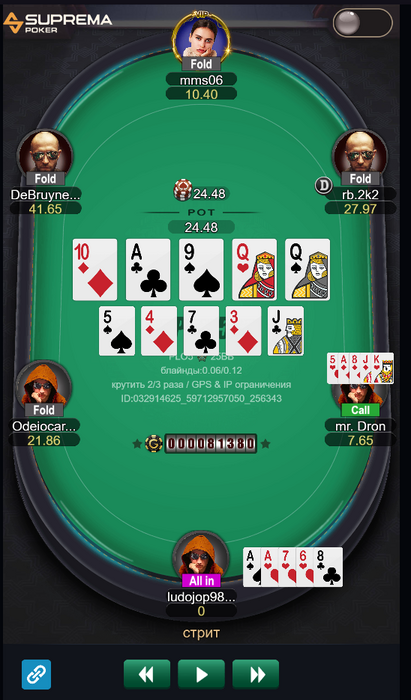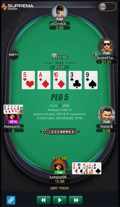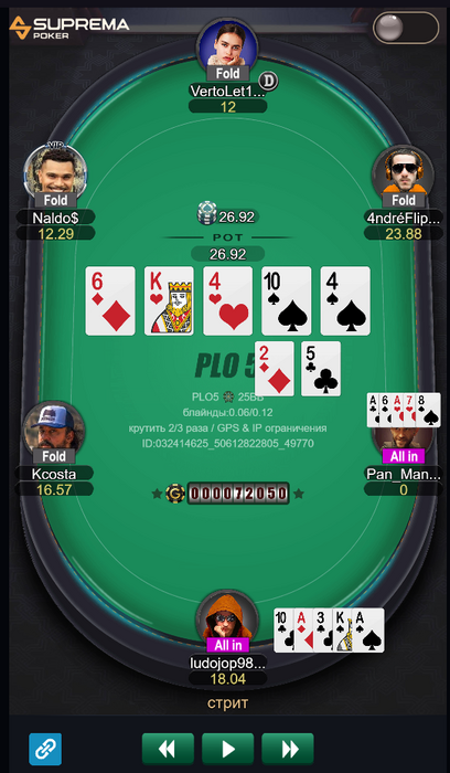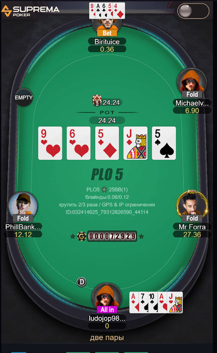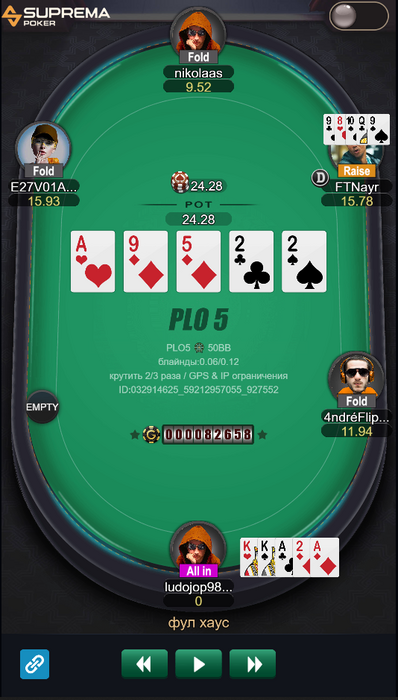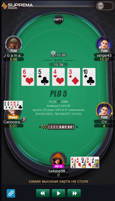 Конкретно наша рука (первая в списке All-in) играется рейз. Я сыграл так же.