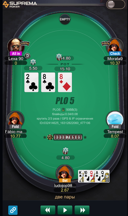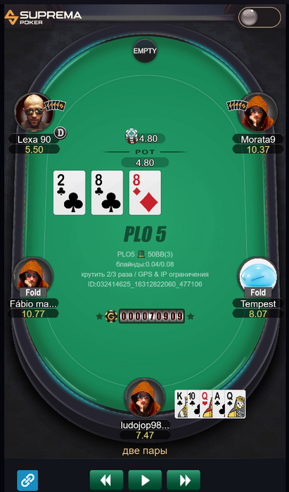 4. Про чек-рейз флопа. Т.к у меня не готовая рука, я хотел получить фолды, т.к блочил диап кола своими ДД и КК и бубами. Ну и так же хотел бы выбить 2 пары, которые в итоге не выкинули.