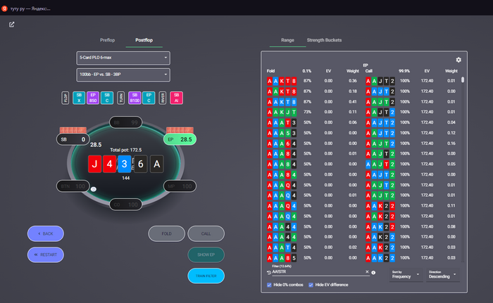 Префлоп солвер играет такую руку колл на 3-бет. Так что допустим ситуацию, что мы заколили 3-бет и попали в ФД на стритовой доске.