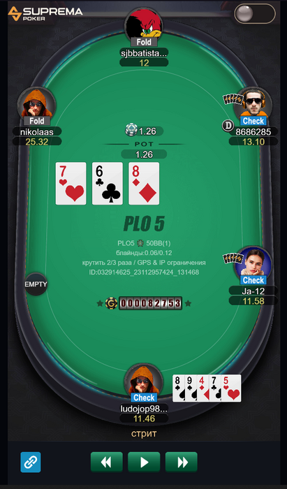 Префлоп лимп банк. Флоп я лид, получаю рейз. Играю колл, т.к никаких подкреп нет.