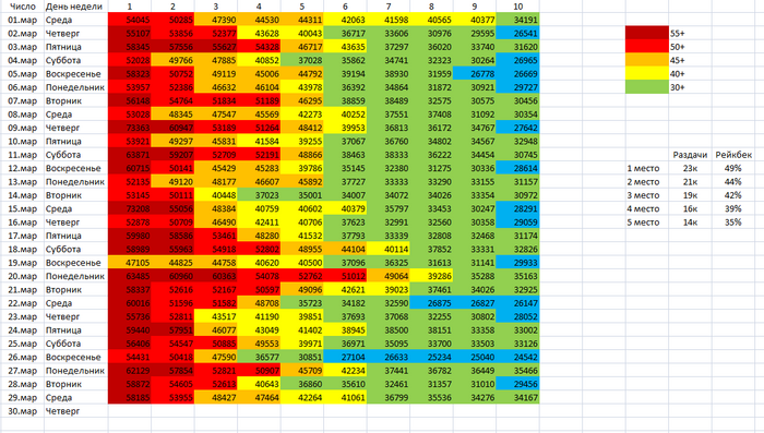 В табличке ниже я полностью разобрал каждый день лидерборда на гг на нл10, прикинул какое количество раздач необходимо отыграть для первых 5 мест. Там же учёл средние выплаты и посчитал количество рейкбека, который даётся за место в гонке.