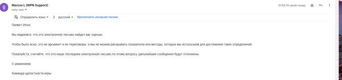 Я, естественно, в недоумении пишу 3-4 письма, перед третьим чекнув акк на Кинге (он тоже заморожен). 3 письма отправил в отдел честности игры, который и занимался этой проверкой, 4-е в саппорт ВПНа.