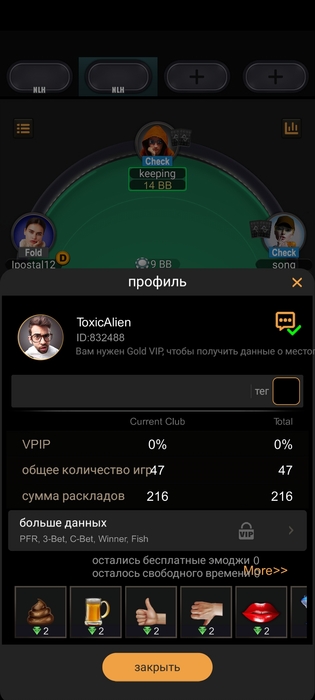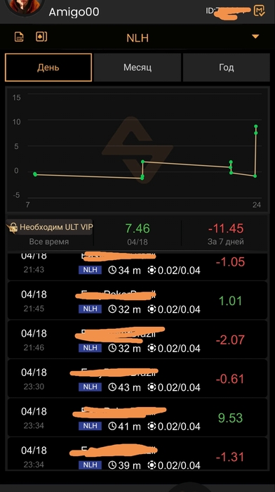 Утром игры было мало, подключил 12лимит, стол с 2 випачами, и в принципе ничем игра не отличается от 8го лимита. Наошибался я правда сегодня баксов на 20, автоколил. Но под конец вывел в +6, и рейкбека около 3х завтра капнет 🤗