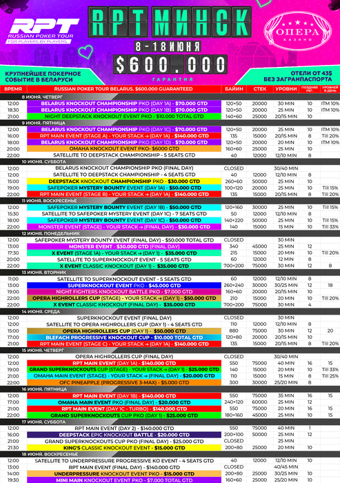 Минск готов играть много, в Минск готовы ехать играть откуда угодно! Мы учли все недочеты предыдущего этапа и внесли необходимые корректировки в расписание будущей июньской серии, чтобы сделать летний этап RPT просто идеальным. Вашему вниманию анонс большого ОДИННАДЦАТИДНЕВНОГО этапа RUSSIAN POKER TOUR в МИНСКЕ: обновленное расписание, доработанные структуры турниров, ваши любимые бесплатные развлечения и тусовки в ночных клубах, а также масса возможностей отобраться через онлайн-сателлиты 😎