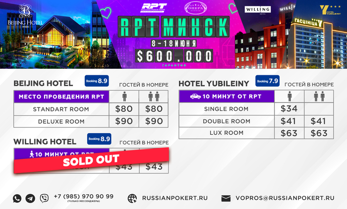 🏆 Разбираем, друзья! Подъехали традиционные пакетные предложения к летнему этапу Russian Poker Tour, который пройдет 8-18 июня в Минске. ⠀ «Пакет участника» - это прекрасная возможность принять участие в турнирах серии, плюс к этому получить значительную скидку на проживание в гостинице. Свободных номеров с каждым днем все меньше и меньше! ⠀ ☝🏻 Как обычно, обладатели ПАКЕТА №2 получают проживание на серии с приличным дисконтом. В рамках будущего этапа мы предлагаем гостям ТРИ пакетных предложения: ⠀ ПАКЕТ № 1️⃣ - $722 ⠀ Обладатели этого пакета получают возможность войти в Главный турнир серии, а также 4 ночи проживания в отеле «Willing». ⠀ ПАКЕТ № 2️⃣ - $4,640 (максимальная выгода!) ⠀ Специально для настоящих любителей покера: практически все ключевые турниры из расписания + 10 ночей в отеле с приличной скидкой! Клик мышкой - и вы бронируете места в престижных турнирах и обеспечиваете огромный дисконт на проживание. ВНИМАНИЕ! В наличии в этот раз только 10 ПАКЕТОВ! ⠀ 💰 КЭШ-ПАКЕТ (бесплатное проживание). ⠀ Как воздух для кэш-игроков! Любой игрок может получить бесплатное проживание в отеле, даже играя на лимите 1/3. Для этого нужно минимально принимать участие в кэш-игре 3 ночи, играя по 5 часов/день. Параллельно с турнирными баталиями на серии нас вновь ожидает реальный кэш-марафон. ⠀ ♠️ Пакеты можно забронировать на нашем сайте russianpokert.ru, или просто по телефону +7 (985) 970-90-99 Viber / WhatsApp / Telegram (звонки только в месседжерах). ⠀ Бронирование любого из пакетов - абсолютно бесплатная процедура! Достаточно связаться с нашим менеджером по контактам, указанным выше и сообщить, что желаете забронировать пакет. Оплата производится на месте проведения серии.