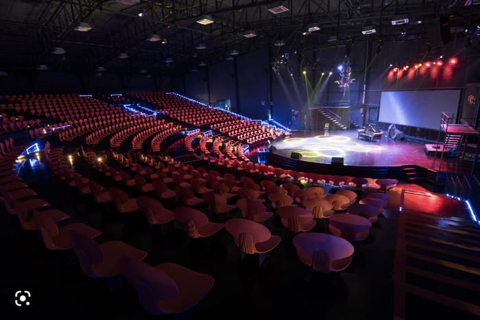 Сцена напоминает большой колизей, штук 15 рядов мест, полукругом вокруг сцены. Самые интересные - первые 2 ряда, так как актеры взаимодействуют со зрителем. Точнее, бегают за ними и вытаскивают на сцену, чтобы делать непотребства и развлекать других зрителей.