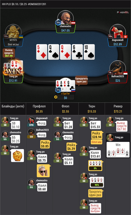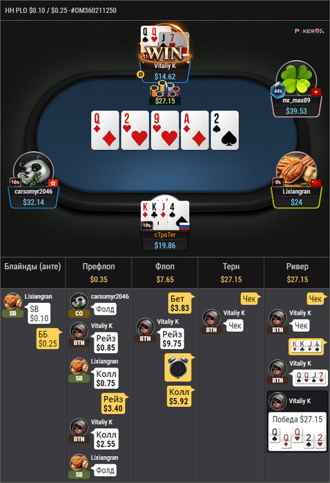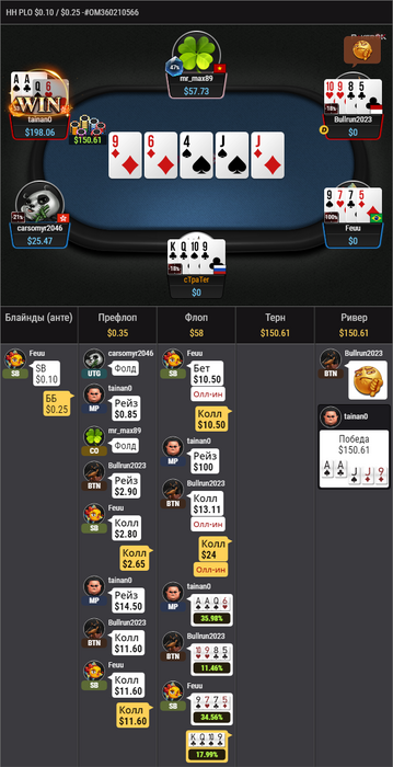 Стараюсь разбирать все крупные проигрышные раздачи.Сомнительные планирую выкладывать на обсуждение, хочу услышать мнение игроков лимитов PLO25+,как бы они разыграли. Чтобы не запутаться, раздачи буду пронумеровывать.
