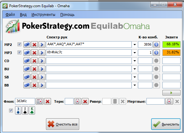 3B у оппонента 6,9%, на флопе я положил ему руку типа AAK/AAQ/AAJ/AAT, на тёрне посчитал что ему добавилось ФД или же изредка AAKJ//ААQT. KK у него будут очень редко, так как я их блокирую, JJ ещё реже так как слишком узкий 3B. Сам же не донкал тёрн, чтобы не выбить блефы/полублефы.