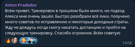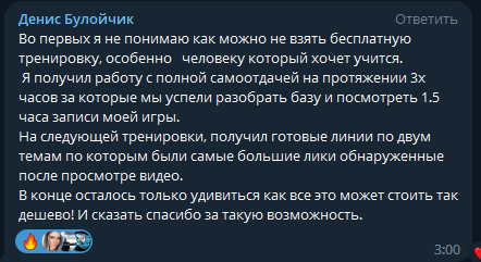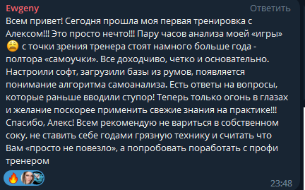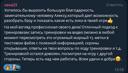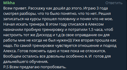 Было пока что 2 тренеровки, но очень доволен тренером. Дал много новой актуальной информации, очень сильно игру перестраиваю свою В общении приятен как человек. Крайне рекомендую 👍