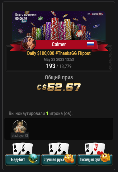 После написания поста пошёл спать, хотел откатать сессию ночью. В итоге сел катать ночью, словил пару неприятных раздач, понял, что не выспался и продолжать играть в таком состоянии не стоит, особенно на лидерборд, решил отложить сессию на следующий день и сесть играть, полностью выспавшись. За полчаса игры зарегистрировало в GGcare flipout с 4bb. Днём сел катать сессию, отчёт о которой скину следующим постом, параллельно начался flipout, и насыпал вот такой приятный бонус, учитывая, что никого за столом я не покрывал.