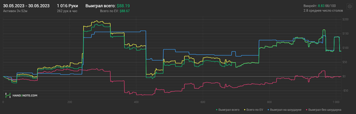 Эх, как уже писал в начальном посте, в первые дни месяца я был в стадии максимального выгорания с удивительной дикой природы в зуме и не притрагивался ни к теории, ни к столам. Затем числа с 10, стало интересно просто раздачки поразбирать чужие, и вот так, постепенно разгоняясь, я набрал к сегодняшнему дню чемпионскую дистанцию в 16к рук!