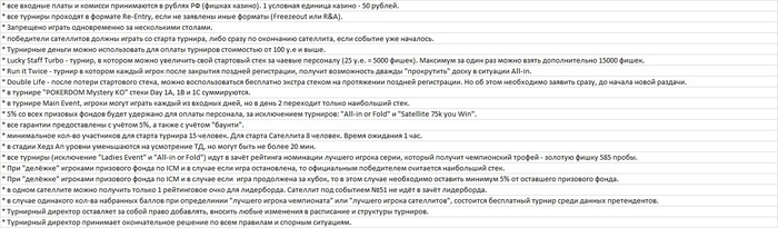 Расписание будущей серии осталось все таким же насыщенным, сохранив в себе разнообразие покерных дисциплин и игровых форматов: холдем, омаха и китайский покер. Плавные структуры и демократичные бай-ины.