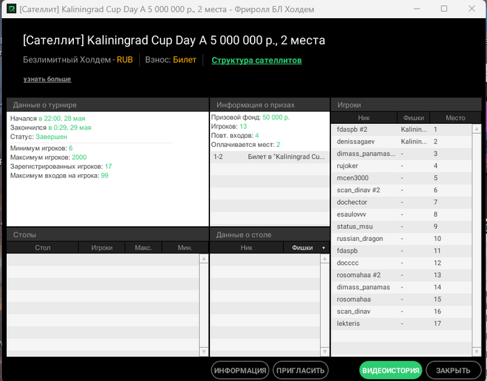 - Калининград Кап 3500р. Гарантия в сателлите 2 билета по 25000р на 2 июля.