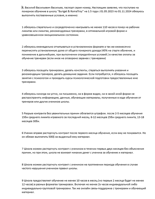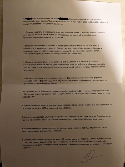 Предварительно списавшись с Иваном "burigat" мы решили заключить контракт на обучение за %. На момент подписания и самого контракта я играл нл20 айпокера.