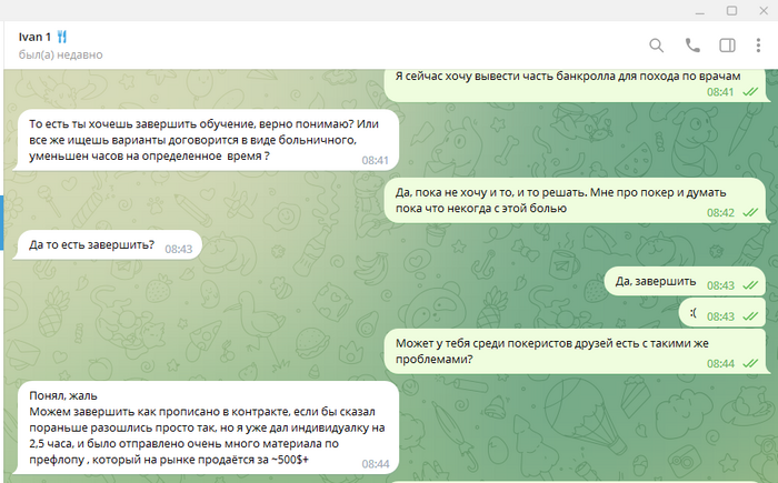 Получается, что ученику всё нравилось, он занимался, посещал все тренировки, активно задавал вопросы, в сумме получил больше часов, чем по контракту, при этом в личке во время обучения, и 16 мая и 31 мая (когда мы обсуждали), Олег и слова не сказал, что обучение его не устраивает. Но почему-то, на форуме он уже заявляет, что обучение ему не нравится. Так же, ученик зачем-то, почистил часть переписки в телеграмме и гугл таблицах. Ситуация со спиной, крайне странная, так как когда у человека что-то болит, он сначала идёт к врачам, разбирается, а не в первый день проблемы пишет в *условный* университет, что отчисляется. Тем более, человек явно собирается дальше заниматься покером. В середине месяца мы обсуждали досрочный уход после двух недель обучения, где я предложил рассчитаться за 500$, но на следующий день он написал, что контракт в силе, а 31 вечером написал что разрыв по личным причинам.