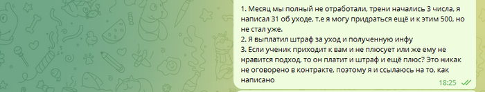 Уже отсюда можно увидеть закономерность того, как человек непоследователен своему же контракту и пытается максимизировать свою прибыль в таком случае. Не уверен я совсем, что мне нужно было вообще что-то ему платить в середине месяца (префлоп- сейчас инфа бесплатная), но на тот момент мыслей не было таких, но я пытался найти разумный выход, никуда не сливался и сам писал Ване. Как понять ученику, который пришёл, что ему не нравится подход/есть личные причины прекратить и он хочет выйти? Сразу плати 500$, потому что Ваня ценит своё время? Я пытался найти разумный выход в той ситуации.
