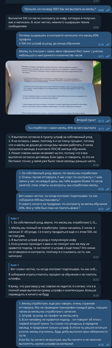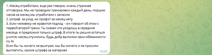 Самое важное:Так же я пишу тут, что раз я должен выплатить 500$ c его слов (за неполный месяц и несправедливый ценник) , то я интересуюсь, могу ли я доходить в таком случае тренировки до конца месяца? Ответ- никто не запрещает. После этого я пишу, что тогда я ещё остаюсь.