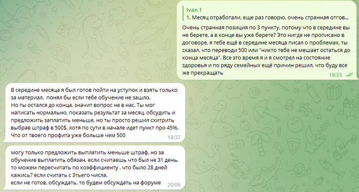 Так же: " просто 500$ компенсации за все вместе ". Просто? Контракт мы не рассматриваем теперь? Там ведь оговорено, что после месяца обучения я выплачиваю штраф в 500$, если хочу выйти. Поэтому я предлагал Ване выплатить 45% от профита за этот период и на этом всё остановить.