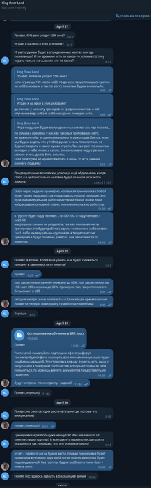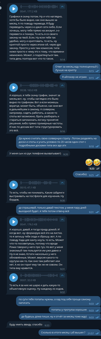На что Олег ответил, что не может воспользоваться материалом, а тренировки не получал в полной мере, далее идет диалог, где Олег считает цену 500$ не справедливой (хотя, когда контракт подписывал, видимо считал справедливой). Для сравнения я привожу ему пример, что часовая тренировка с разбором базы от рега моего уровня стоит минимум 300$, а расчеты солвера, которые ему были выданы 500$ и более