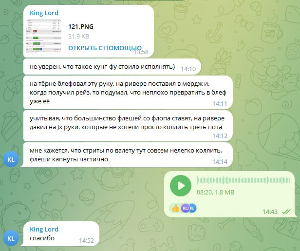 1) Была выбрана мной тема для тренировки, такая как математика покера (всё что связано), как её применять в игре и как работает всё это с солвером ( ведь ренжи выстраиваются в соотношении велью/блефов). В итоге на тренировке дошло до того, что я сам и ещё 1 ученик помогал Ване посчитать количество блефов на ривере, исходя из велью комб оппа на ставку 1/2 пота. Так же небольшой ступор был и в просчёте элементарной формулы шансов банка. Больше всего ошарашело то, что рег 1к говорит, что математику знать не обязательно, а все эти формулы это очень сложно и никак не найдут своего применения в деле, поэтому он сам не пользуется ей уже давно и нам не стоит заморачиваться сильно (есть этот момент из сохраненной тренировки, но не знаю, могу ли я выложить исходя из пунктов договора даже отрывок его этой фразы).