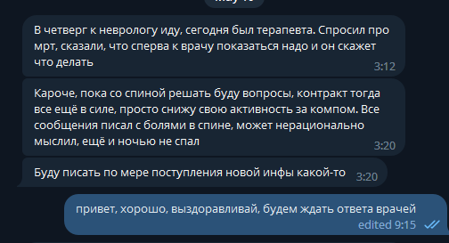 Комментарии Вани касательно моей спины- это тоже нечто. Человек не знает, каково мне было в эти моменты, вместо меня описывает мою ситуацию и додумывает сам. Я играл по мере возможностей, когда-то стоя, когда-то сидя. Я и потом ходил на массажи/процедуры, но старался играть, после, поняв, что я не смогу жить в таком ритме и ещё поняв, что в некоторых вещах тренер сам не совсем понимает, я решил объеденить этот пазл в одно целое и написал, что всё же ухожу.